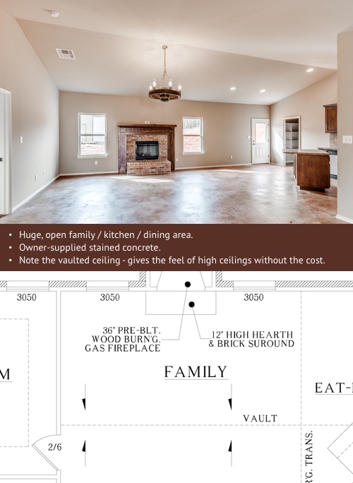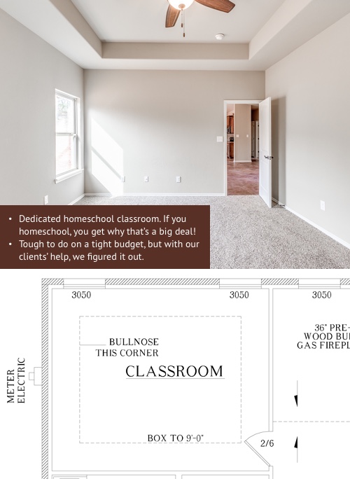 Ashley and Mike are budget-conscious, like a lot of families, and they wanted to make sure they got the most living space possible for their money—including room for a classroom. With seven people living in their home, they wanted to make sure everyone had plenty of space! Their home includes: