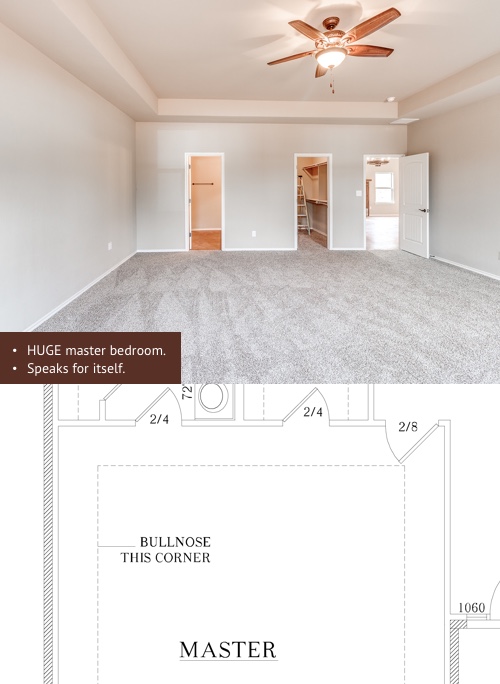 Since Ashley and her family lived on their own acreage, they already had a shop and really didn’t want to waste money on a garage. Instead, we used the money that typically would have gone to a garage to create a large, relaxing master suite.